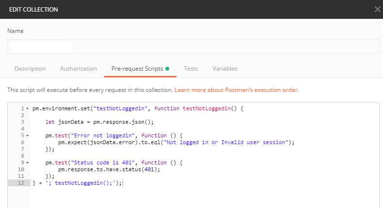 Q: Tôi có 1 số common tests, được áp dụng cho các trường hợp giống nhau, có cách nào để tôi không phải copy-patse code vào từng mục [Tests] của từng request không? Ví dụ: tôi muốn check tất cả các request mà sử dụng token sai đều trả về mã code 401 và error_message là “Not logged in or Invalid user session”